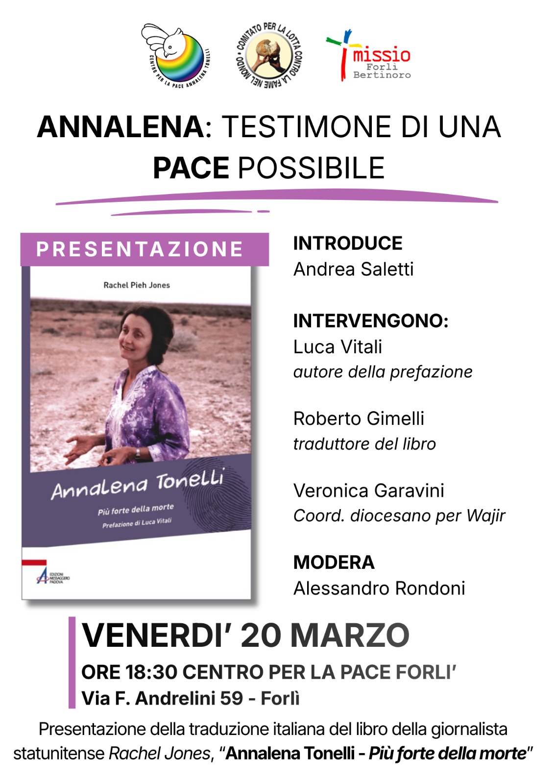 L’evento si terrà presso il Centro per la Pace “Annalena Tonelli”, in via F. Andrelini 59, Forlì.