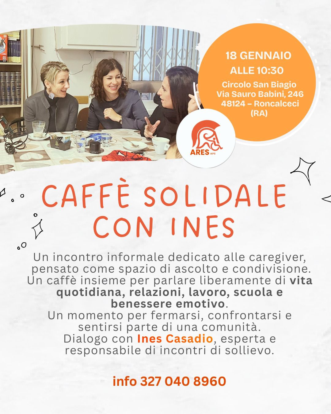 Il Caffè solidale con Ines è previsto per sabato 18 gennaio 2026 alle 10,30 presso il Circolo San Biagio, in via Sauro Babini 246 a Roncalceci (RA).