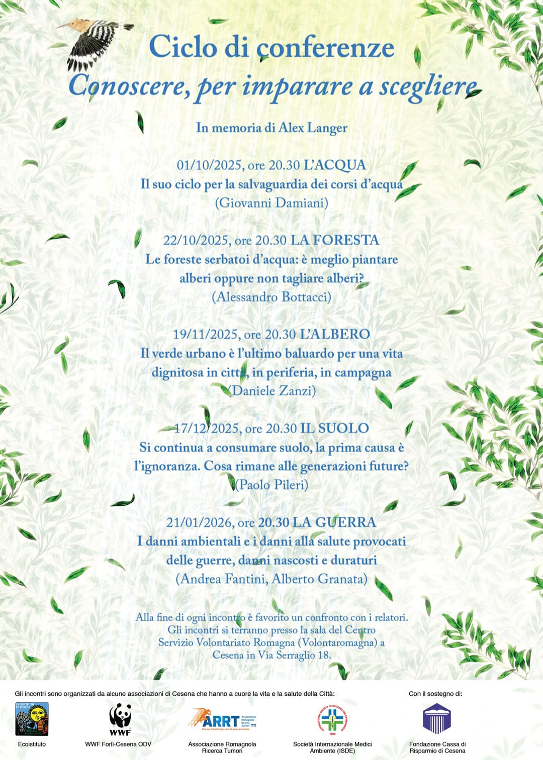 Cinque appuntamenti per riflettere sul rapporto tra ambiente, salute e responsabilità collettiva. Prende avvio il ciclo di conferenze “Conoscere, per imparare a scegliere”, promosso in memoria di Alexander Langer organizzato da ARRT, WWF, Ecoistituto, ISDE e il sostegno della Fondazione Cassa di Risparmio di Cesena