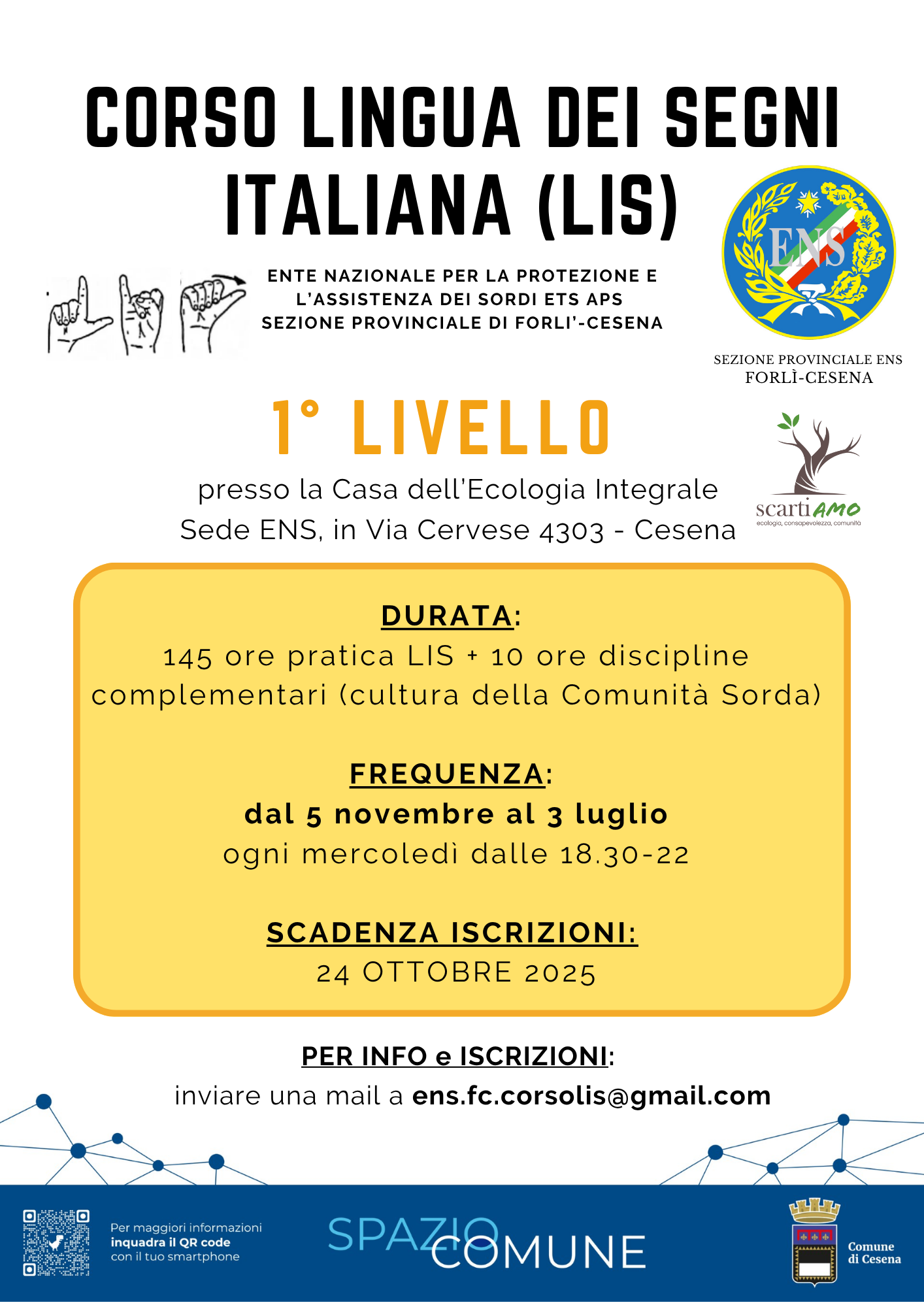 La Sezione Provinciale ENS (Ente Nazionale per la Protezione e l’Assistenza dei Sordi ETS APS) di Forlì-Cesena promuove il Corso di Lingua dei Segni Italiana (LIS) – 1° Livello, un percorso formativo rivolto a chi desidera apprendere la LIS e approfondire la cultura della Comunità Sorda.