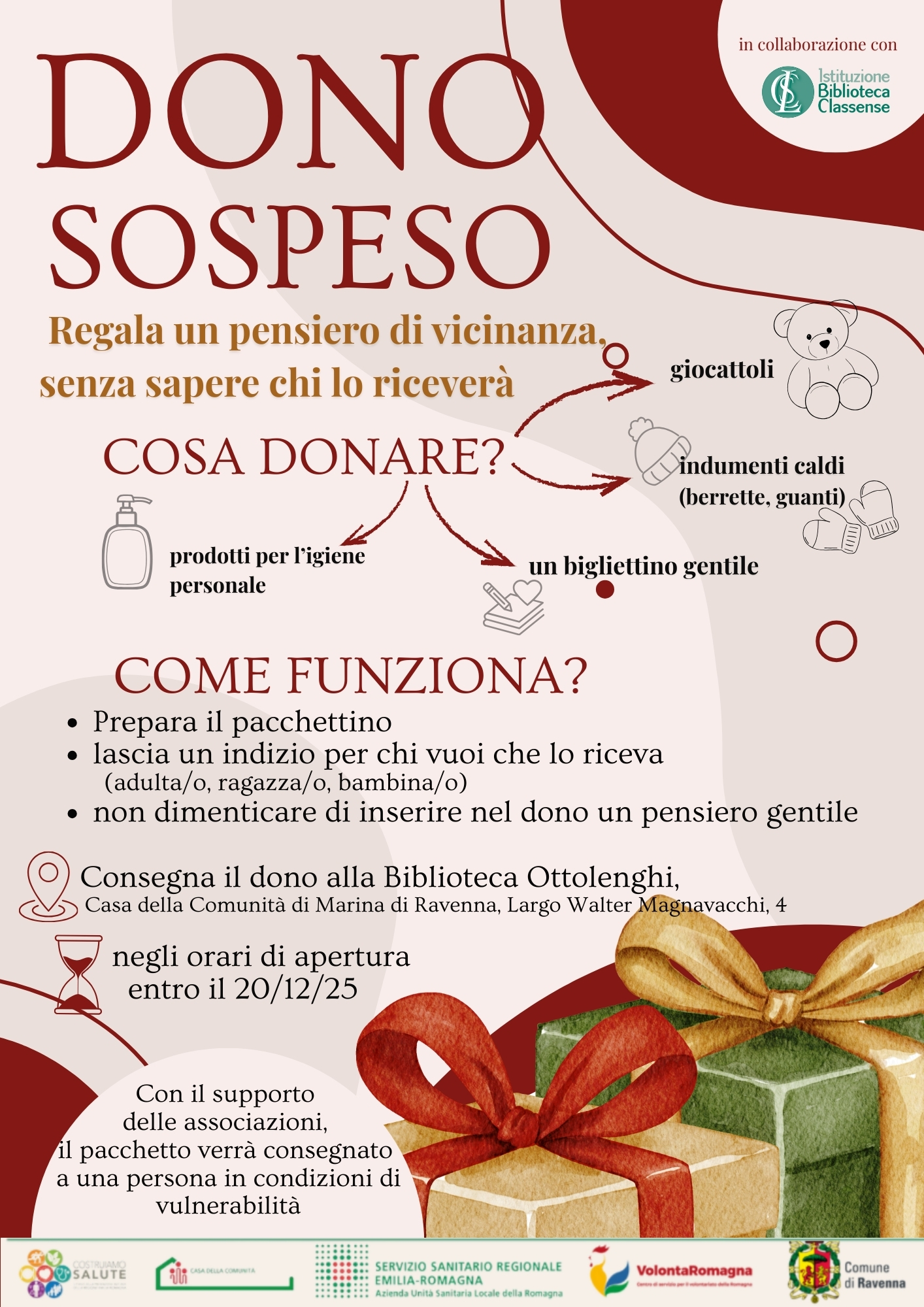 “Dono Sospeso” è l’iniziativa lanciata dalla Casa della Comunità di Marina di Ravenna, in collaborazione con la Biblioteca classense, per coinvolgere le cittadine e i cittadini e regalare un pensiero di vicinanza a chi si trova in una condizione di vulnerabilità.