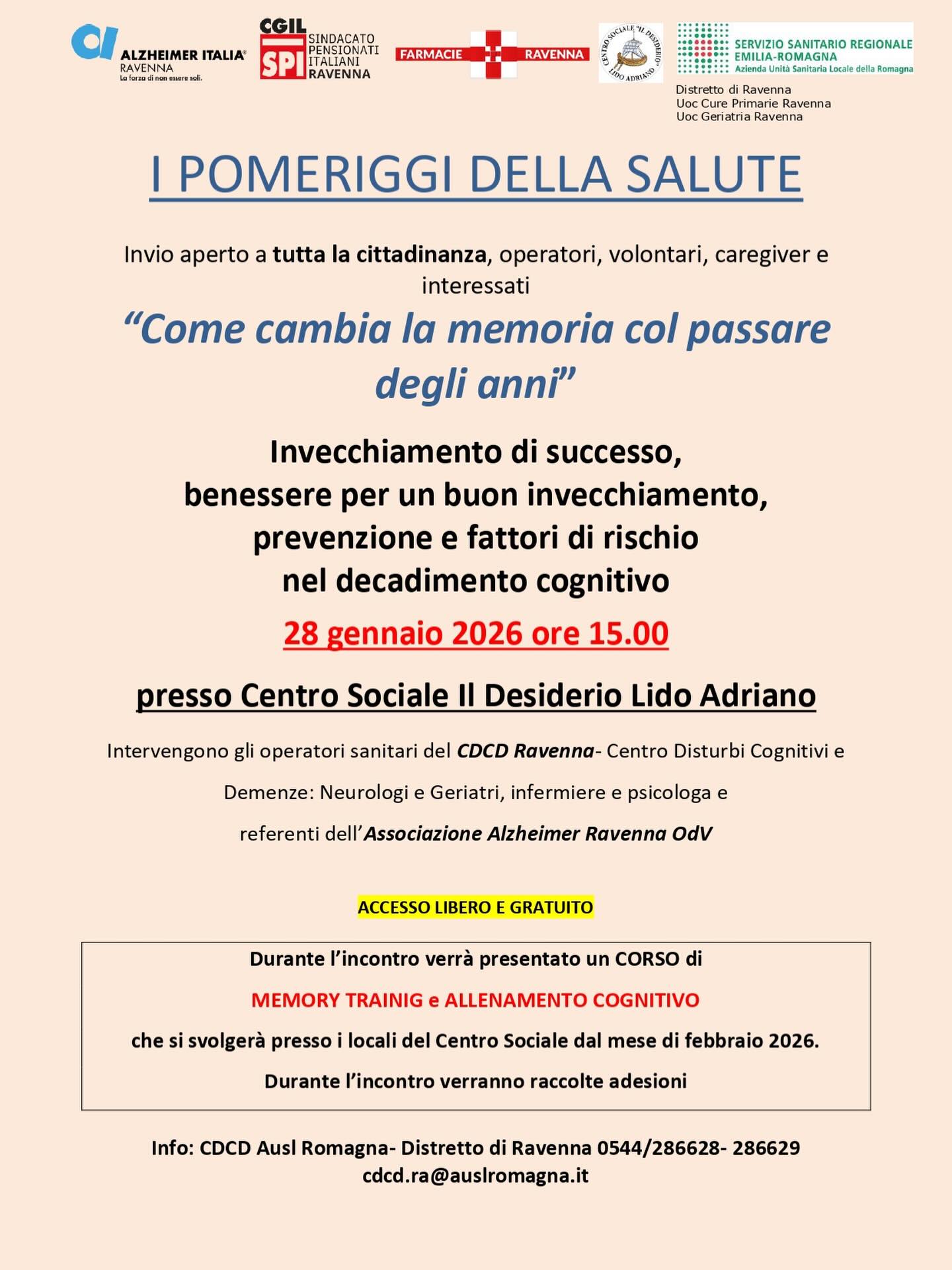 L’iniziativa, dal titolo “Come cambia la memoria col passare degli anni”, si terrà mercoledì 28 gennaio 2026, con inizio alle 15, presso il Centro Sociale Il Desiderio di Lido Adriano. L’invito è aperto a tutta la cittadinanza, oltre che a operatori, volontari, caregiver e persone interessate.