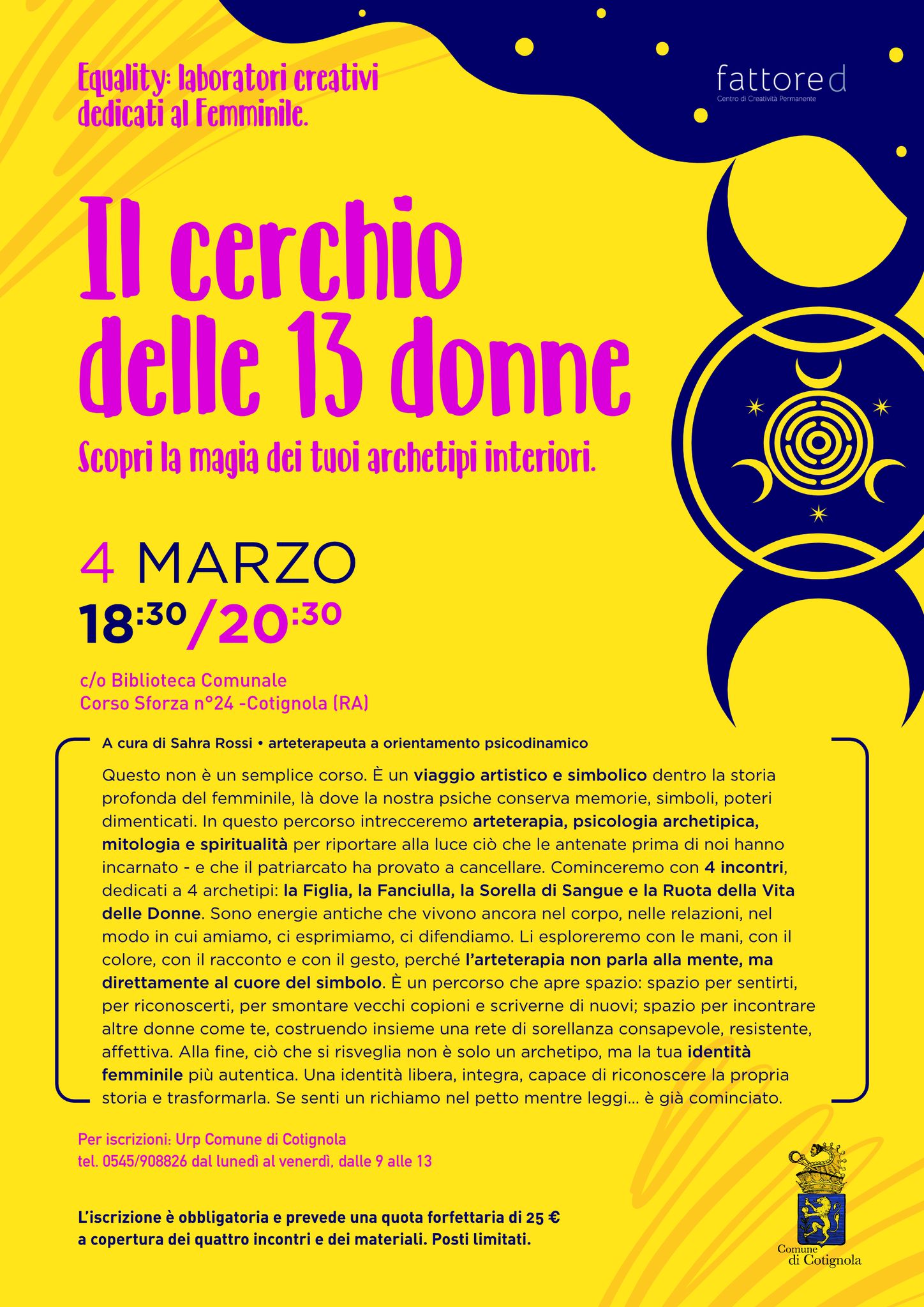 L’iniziativa, curata da Sahra Rossi per Fattore D Aps, propone un viaggio profondo tra psicologia archetipica, mitologia e spiritualità, in uno spazio sicuro di confronto e consapevolezza.