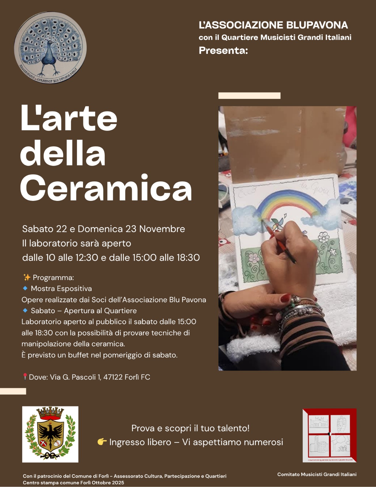 L’Associazione BluPavona, in collaborazione con il Quartiere Musicisti Grandi Italiani, organizza per sabato 22 e domenica 23 novembre 2025 l’evento “L’arte della Ceramica”, un’iniziativa pensata per avvicinare il pubblico alle tecniche artistiche e artigianali legate alla lavorazione dell’argilla.