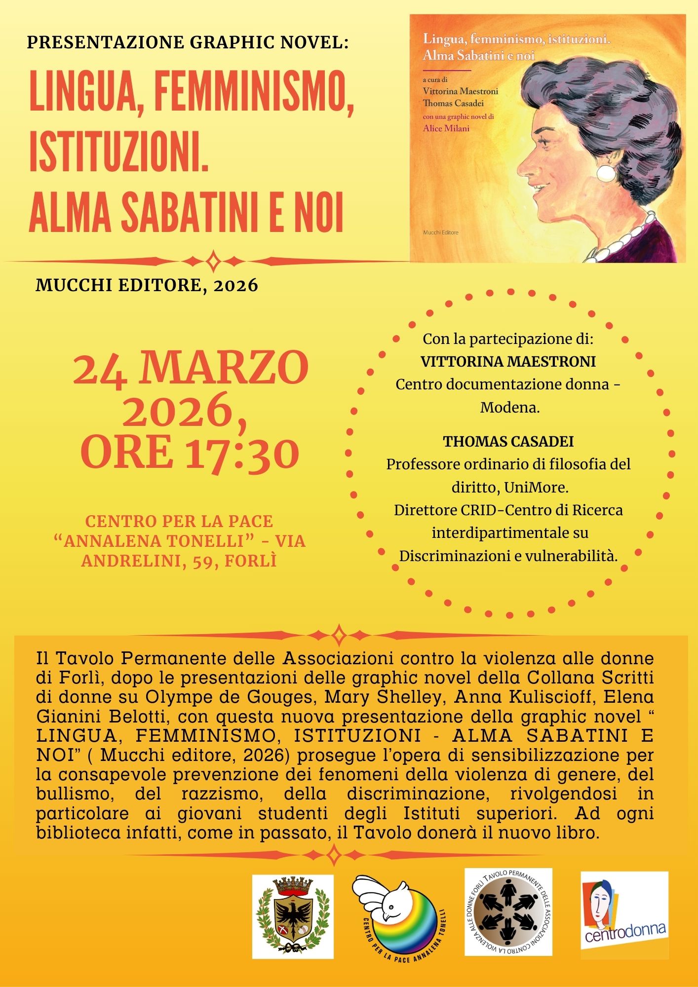 Il Tavolo Permanente delle Associazioni contro la violenza alle donne di Forlì annuncia la presentazione della nuova graphic novel “Lingua, Femminismo, Istituzioni. Alma Sabatini e Noi”, pubblicata da Mucchi Editore nel 2026.
