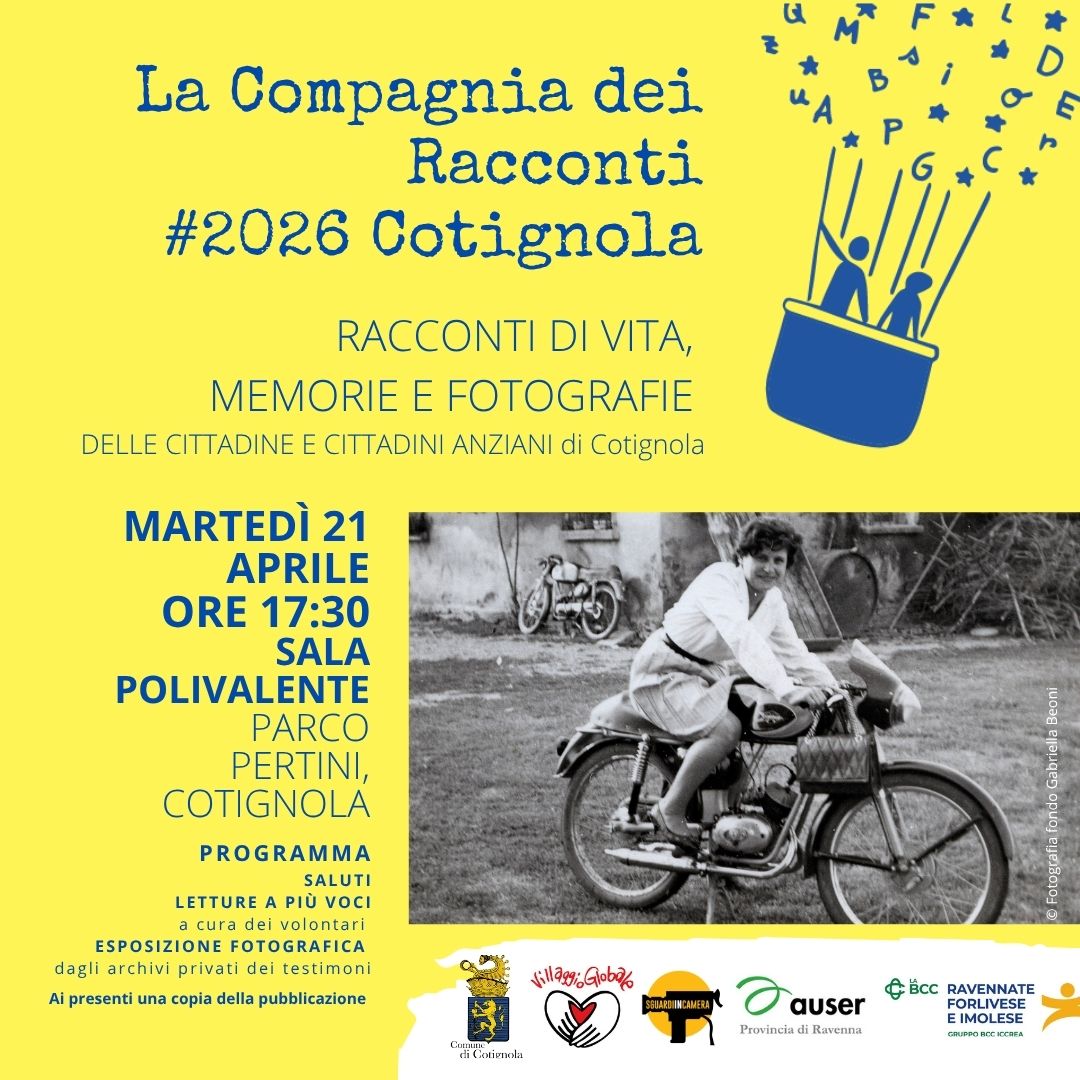 Torna a Cotignola l’appuntamento con La Compagnia dei Racconti #2026, un progetto dedicato alla raccolta e alla valorizzazione delle memorie dei cittadini più anziani. L’evento di presentazione si terrà martedì 21 aprile alle 17,30, presso la Sala Polivalente del Parco Pertini a Cotignola (Ra).
