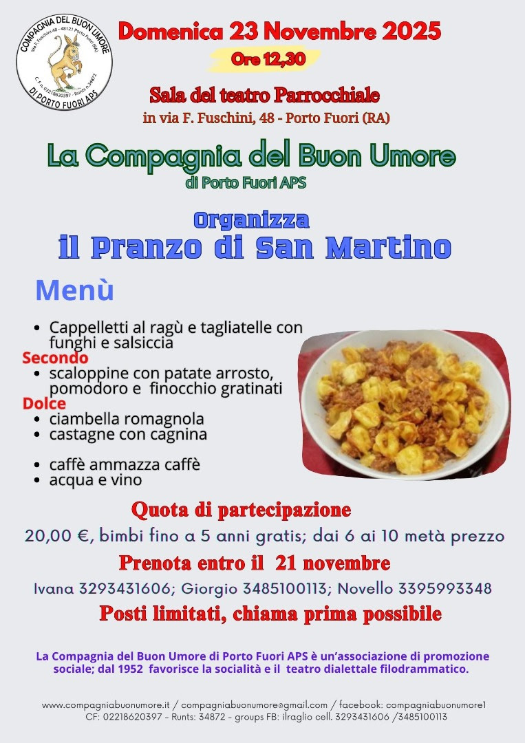 La Compagnia del Buon Umore di Porto Fuori Aps invita la comunità al tradizionale Pranzo di San Martino, in programma domenica 23 novembre 2025 alle 12,30 nella sala del teatro parrocchiale di via F. Fuschini 48 a Porto Fuori (Ra).