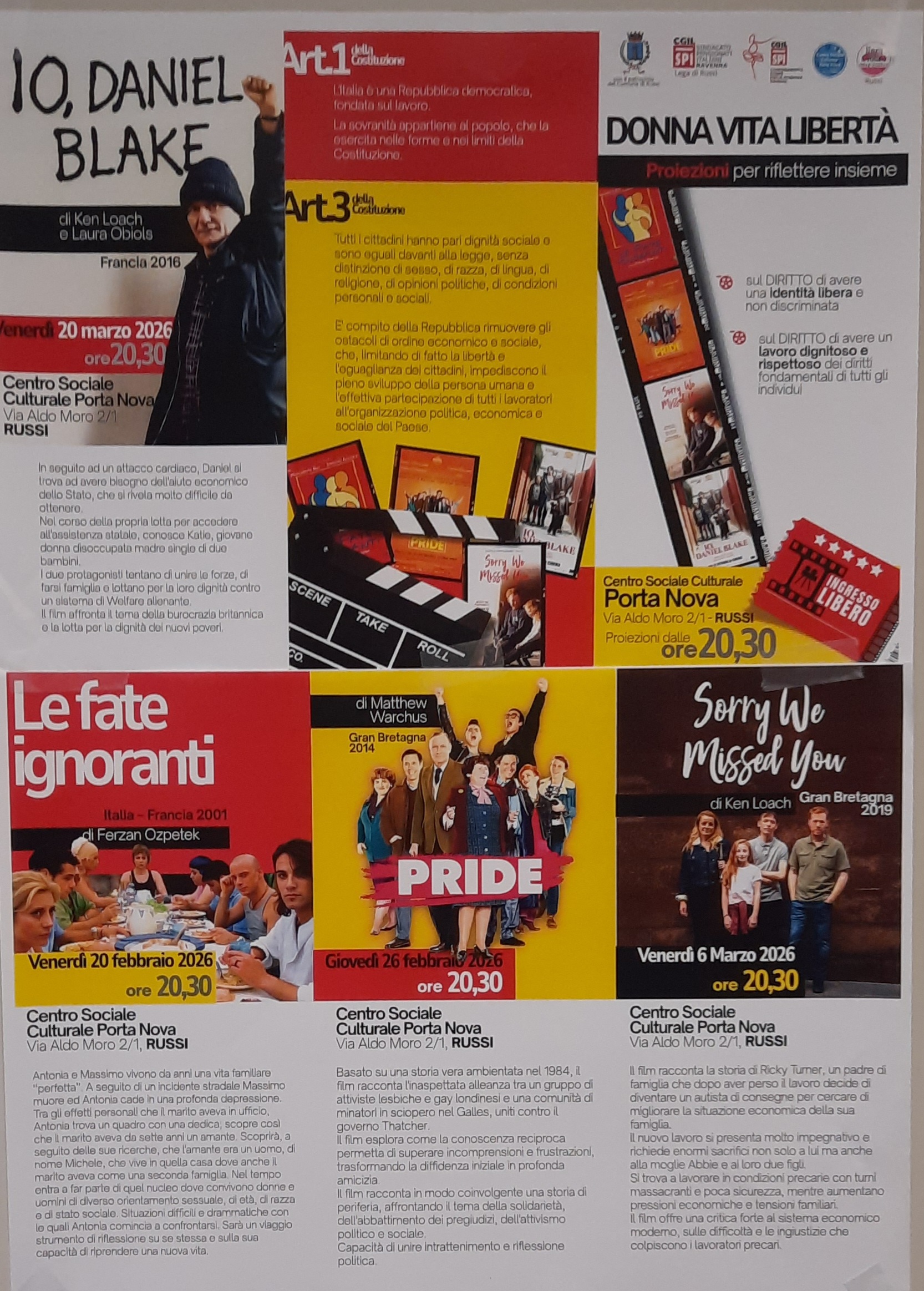 Gli incontri si svolgeranno nei locali del Centro Sociale Culturale Porta Nova, situato a Russi in via Aldo Moro 2/1, con inizio delle proiezioni alle 20,30.