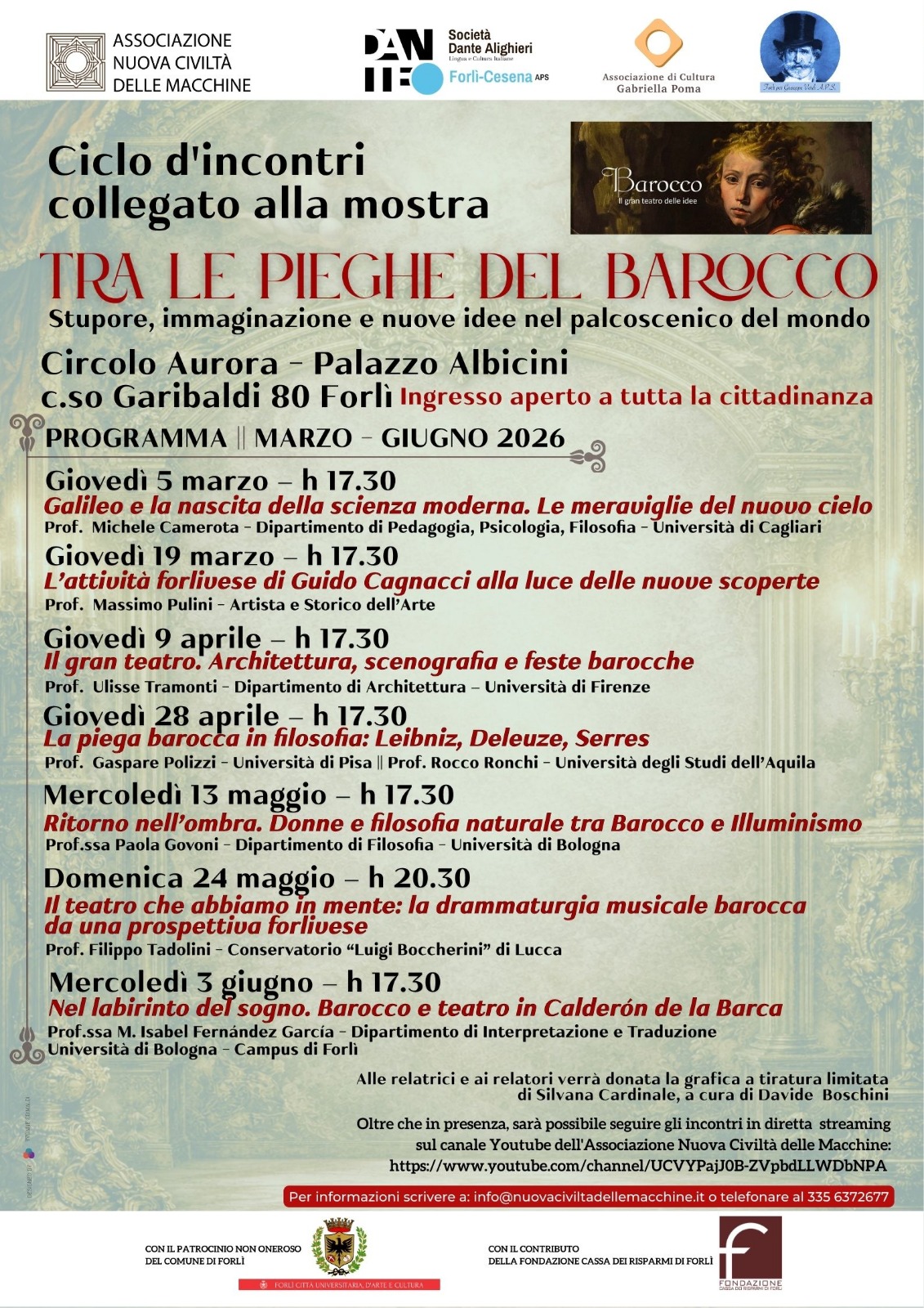 L’Associazione Nuova Civiltà delle Macchine, Società Dante Alighieri Forlì-Cesena APS e Associazione di Cultura Gabriella Poma presentano un nuovo ciclo di incontri dedicato all’immaginario barocco e alle sue molteplici declinazioni: dalla nascita della scienza moderna alle arti figurative, dall’architettura teatrale alla filosofia, fino alla drammaturgia musicale e al teatro europeo del Seicento.